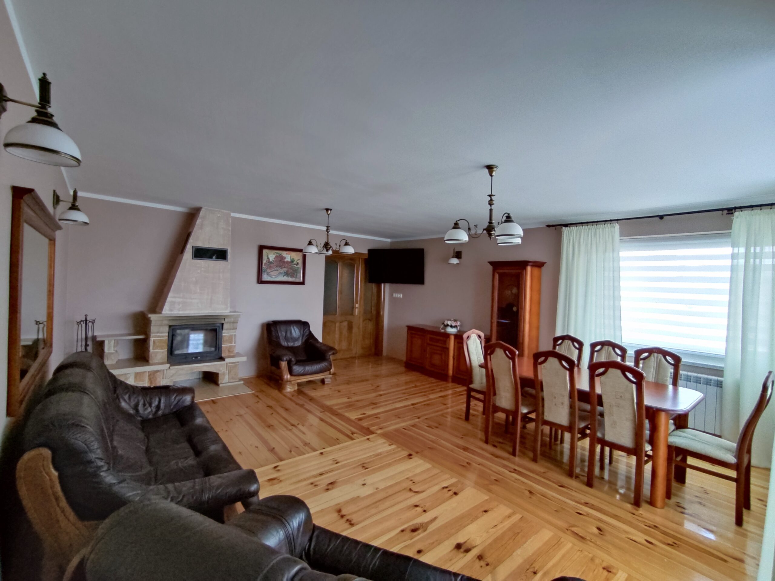 Dla naszych Gości oddajemy przestronny salon z kominkiem połączony z dużym tarasem, gdzie można odpocząć wygodnie na skórzanych kanapach oglądając 65” telewizor. Duży stół 12 osobowy pozwala na spożywanie posiłku w większym gronie. Zapraszamy osoby indywidualne jak również grupy zawodowe na spotkania biznesowe.